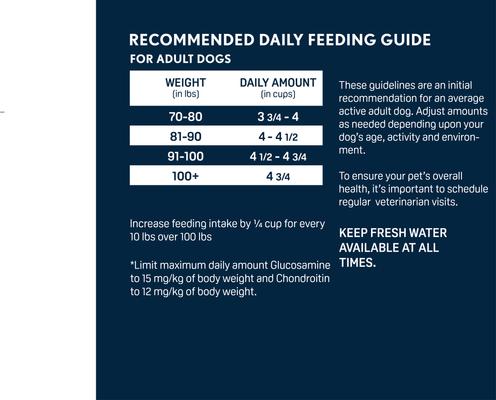 Increase feeding intake by 1/2 cup for every 10 lbs over 100 lbs.