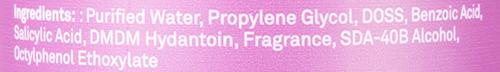 Purified Water, Propylene Glycol, Doss, Benzoic Acid, Salicylic Acid, Dmdm Hydantoin, Fragrance, SDA-40B Alcohol, Octylphenol Ethoxylate.