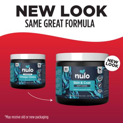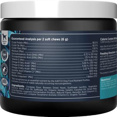 Cuide la piel de su cachorro con los masticables suaves Nulo Skin & Coat para perros. Estos deliciosos masticables suaves están diseñados para mantener un pelaje suave, sedoso, brillante y saludable. Contienen una variedad de ingredientes bioactivos y funcionales, incluyendo una mezcla de aceites de sardina, arenque, caballa y anchoa, así como aceite de coco, algas marinas secas y cúrcuma orgánica. Los ácidos grasos omega-3 y omega-6 favorecen una respuesta inmunitaria e inflamatoria saludable para promover una piel sana y aliviar las alergias ocasionales o estacionales. Además, los ácidos grasos omega-9 brindan apoyo nutricional para la salud cognitiva de su mascota. Los masticables suaves para piel y pelaje de Nulo son una excelente opción para perros adultos y mayores. Fabricado en EE. UU.