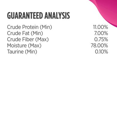 Trout, Chicken, Chicken Liver, Salmon Broth, Tuna, Salmon, Natural Flavor, Guar Gum, Potassium Chloride, Agar-Agar, Choline Chloride, Taurine, Cranberries, Pumpkin, Menhaden Fish Oil (preserved with Mixed Tocopherols), Tomato, Kelp, Yucca Schidigera Extract, Salt, Magnesium Sulfate, Sodium Carbonate, Iron Proteinate, Zinc Proteinate, Thiamine Mononitrate, Vitamin E Supplement, Copper Proteinate, Manganese Proteinate, Sodium Selenite, Niacin Supplement, d-Calcium Pantothenate, Pyridoxine Hydrochloride, Riboflavin Supplement, Vitamin A Supplement, Biotin, Potassium Iodide, Vitamin D3 Supplement, Vitamin B12 Supplement, Folic Acid, Rosemary Extract.