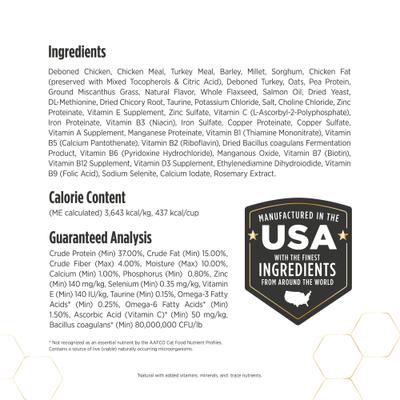 Deboned Chicken, Chicken Meal, Turkey Meal, Barley, Millet, Sorghum, Chicken Fat (Preserved With Mixed Tocopherols & Citric Acid), Deboned Turkey, Oats, Pea Protein, Ground Miscanthus Grass, Natural Flavor, Whole Flaxseed, Salmon Oil, Dried Yeast, DL-Methionine, Dried Chicory Root, Taurine, Potassium Chloride, Salt, Choline Chloride, Zinc Proteinate, Vitamin E Supplement, Zinc Sulfate, Vitamin C (L-Ascorbyl-2-Polyphosphate), Iron Proteinate, Vitamin B3 (Niacin), Iron Sulfate, Copper Proteinate, Copper Sulfate, Vitamin A Supplement, Manganese Proteinate, Vitamin B1 (Thiamine Mononitrate), Vitamin B5 (Calcium Pantothenate), Vitamin B2 (Riboflavin), Dried Bacillus Coagulans Fermentation Product, Vitamin B6 (Pyridoxine Hydrochloride), Manganous Oxide, Vitamin B7 (Biotin), Vitamin B12 Supplement, Vitamin D3 Supplement, Ethylenediamine Dihydroiodide, Vitamin B9 (Folic Acid), Sodium Selenite, Calcium Iodate, Rosemary Extract.