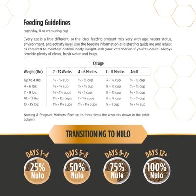 Every cat is a little different, so the ideal feeding amount may vary with age, neuter status, environment, and activity level. Please use the feeding information below as a starting guideline only and adjust as required to maintain optimal body weight. Check with your veterinarian if you’re unsure. Always provide plenty of clean, fresh water and hugs.