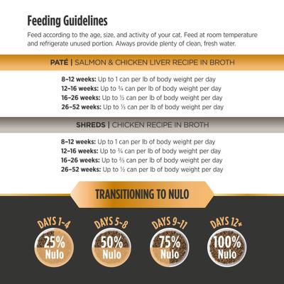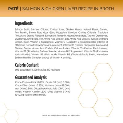 Salmon & Chicken Liver Paté Recipe in Broth | 8–12 weeks•Up to 1 can per lb of body weight per day12–16 weeks• Up to 3/4 can per lb of body weight per day16–26 weeks• Up to 1/2 can per lb of body weight per day26–52 weeks•Up to 1/3 can per lb of body weight per day