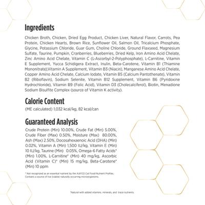 Chicken Broth, Chicken, Salmon, Dried Egg Product, Carrots, Chicken Heart, Pea Protein, Natural Flavor, Sunflower Oil, Brown Rice, Glycine, Potassium Chloride, Tricalcium Phosphate, Guar Gum, Choline Chloride, Ground Flaxseed, Salmon Oil, Magnesium Sulfate, Taurine, Pumpkin, Cranberries, Blueberries, Dried Kelp, Iron Amino Acid Chelate, Zinc Amino Acid Chelate, Vitamin E Supplement, Yucca Schidigera Extract, Inulin, Vitamin C (L-Ascorbyl-2-Polyphosphate), Vitamin B1 (Thiamine Mononitrate), Vitamin A Supplement, Vitamin B3 (Niacin), Manganese Amino Acid Chelate, Copper Amino Acid Chelate, Calcium Iodate, Vitamin B5 (Calcium Pantothenate), Vitamin B2 (Riboflavin), Sodium Selenite, Vitamin B12 Supplement, Vitamin B6 (Pyridoxine Hydrochloride), Vitamin B9 (Folic Acid), Vitamin D3 (Cholecalciferol), Biotin, Menadione Sodium Bisulfite Complex (source of Vitamin K activity).