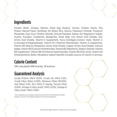 Chicken Broth, Chicken, Salmon, Dried Egg Product, Carrots, Chicken Heart, Pea Protein, Natural Flavor, Sunflower Oil, Brown Rice, Glycine, Potassium Chloride, Tricalcium Phosphate, Guar Gum, Choline Chloride, Ground Flaxseed, Salmon Oil, Magnesium Sulfate, Taurine, Pumpkin, Cranberries, Blueberries, Dried Kelp, Iron Amino Acid Chelate, Zinc Amino Acid Chelate, Vitamin E Supplement, Yucca Schidigera Extract, Inulin, Vitamin C (L-Ascorbyl-2-Polyphosphate), Vitamin B1 (Thiamine Mononitrate), Vitamin A Supplement, Vitamin B3 (Niacin), Manganese Amino Acid Chelate, Copper Amino Acid Chelate, Calcium Iodate, Vitamin B5 (Calcium Pantothenate), Vitamin B2 (Riboflavin), Sodium Selenite, Vitamin B12 Supplement, Vitamin B6 (Pyridoxine Hydrochloride), Vitamin B9 (Folic Acid), Vitamin D3 (Cholecalciferol), Biotin, Menadione Sodium Bisulfite Complex (source of Vitamin K activity).