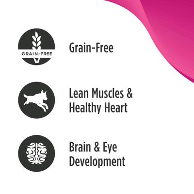 - Low-glycemic and specially made free of grains, corn, wheat or soy for pups with food sensitivities.