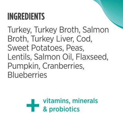 Turkey, Salmon Broth, Turkey Broth, Cod, Turkey Liver, Peas, Sweet Potatoes, Lentils, Natural Flavor, Ground Flaxseed, Salmon Oil (Preserved With Mixed Tocopherols), Guar Gum, Potassium Chloride, Pumpkin, Cranberries, Blueberries, Salt, Dicalcium Phosphate, Choline Chloride, Agar-Agar, Zinc Proteinate, Iron Proteinate, Sodium Carbonate, Thiamine Mononitrate, Vitamin E Supplement, Copper Proteinate, Manganese Proteinate, Sodium Selenite, Cobalt Proteinate, Niacin Supplement, D-Calcium Pantothenate, Vitamin A Supplement, Riboflavin Supplement, Biotin, Vitamin B12 Supplement, Potassium Iodide, Pyridoxine Hydrochloride, Vitamin D3 Supplement, Folic Acid