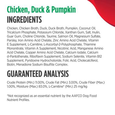 Chicken, Duck & Pumpkin: Chicken, Chicken Broth, Duck, Duck Broth, Pumpkin, Coconut Oil, Tricalcium Phosphate, Potassium Chloride, Xanthan Gum, Salt, Inulin, Guar Gum, Choline Chloride, Taurine, Salmon Oil, Magnesium Sulfate, Parsley, Iron Amino Acid Chelate, Zinc Amino Acid Chelate, Vitamin E Supplement, L-Carnitine, L-Ascorbyl-2-Polyphosphate, Thiamine Mononitrate, Vitamin A Supplement, Nicotinic Acid, Manganese Amino Acid Chelate, Copper Amino Acid Chelate, Calcium Iodate, Calcium d-Pantothenate, Riboflavin Supplement, Sodium Selenite, Vitamin B12 Supplement, Pyridoxine Hydrocholoride, Folic Acid, Cholecalciferol, Biotin, Menadione Sodium Bisulfite Complex.