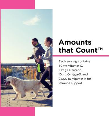 - Each chew contains 50mg of vitamin C, 10mg of quercetin, and 10mg of omega 3.