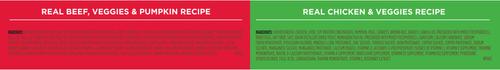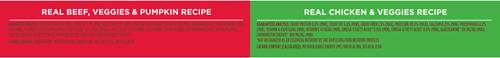 Carne de res y Vegetales: Caldo de res, res, pollo, hígado, concentrado de proteína de soya, calabaza, guisantes, zanahorias, arroz integral, aceite de canola (conservado con tocoferoles mixtos), cebada, melaza de caña, huevos deshidratados, fibra de avena, sal, levadura de cerveza deshidratada, aceite de pescado sábalo (conservado con tocoferoles mixtos), goma guar, carbonato de calcio, tripolifosfato de sodio, cloruro de potasio, minerales (proteinato de zinc, sulfato de zinc, sulfato ferroso, proteinato de hierro, sulfato de cobre, proteinato de cobre, selenito de sodio, sulfato de manganeso, proteinato de manganeso, yodato de calcio), vitaminas (L-ascorbil-2-polifosfato (fuente de vitamina C), suplemento de vitamina E, mononitrato de tiamina, niacina, D-pantotenato de calcio, suplemento de vitamina A, suplemento de riboflavina, suplemento de vitamina D3, suplemento de vitamina B12, piridoxina Clorhidrato de tiamina, ácido fólico), carragenina, mononitrato de tiamina, vitamina E, extracto de romero.Pollo y Vegetales: Caldo de pollo, pollo, hígado, concentrado de proteína de soya, calabaza, guisantes, zanahorias, arroz integral, cebada, aceite de canola (conservado con tocoferoles mixtos), huevos deshidratados, fibra de avena, sal, levadura de cerveza deshidratada, aceite de pescado Menhaden (conservado con tocoferoles mixtos), goma guar, carbonato de calcio, tripolifosfato de sodio, cloruro de potasio, minerales (proteinato de zinc, sulfato de zinc, sulfato ferroso, proteinato de hierro, sulfato de cobre, proteinato de cobre, selenito de sodio, sulfato de manganeso, proteinato de manganeso, yodato de calcio), vitaminas (L-ascorbil-2-polifosfato (fuente de vitamina C), suplemento de vitamina E, mononitrato de tiamina, niacina, D-pantotenato de calcio, suplemento de vitamina A, suplemento de riboflavina, suplemento de vitamina D3, suplemento de vitamina B12, clorhidrato de piridoxina, ácido fólico), carragenina. Mononitrato de tiamina, vitamina E, extracto de romero.