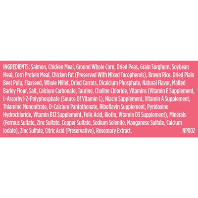 Salmon, Chicken Meal, Ground Whole Corn, Dried Peas, Grain Sorghum, Soybean Meal, Corn Gluten Meal, Chicken Fat (preserved With Mixed Tocopherols), Brown Rice, Dried Plain Beet Pulp, Flaxseed, Whole Millet, Dried Carrots, Dicalcium Phosphate, Natural Flavor, Malted Barley Flour, Salt, Calcium Carbonate, Taurine, Choline Chloride, Vitamins (vitamin E Supplement, Ascorbic Acid (source Of Vitamin C), Niacin, Vitamin A Supplement, Thiamine Mononitrate, D-calcium Pantothenate, Riboflavin Supplement, Pyridoxine Hydrochloride, Vitamin B12 Supplement, Folic Acid, Biotin, Vitamin D3 Supplement), Minerals (ferrous Sulfate, Zinc Sulfate, Copper Sulfate, Sodium Selenite, Manganese Sulfate, Calcium Iodate), Zinc Sulfate, Citric Acid (preservative), Rosemary Extract.