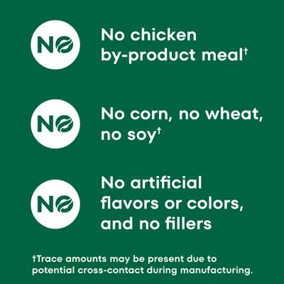 - No chicken by-product meal, no corn, wheat, or soy protein, and no artificial preservatives or flavors although trace amounts may be present due to potential cross-contact during manufacturing.