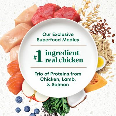Chicken, Chicken Meal, Whole Grain Sorghum, Whole Grain Oatmeal, Whole Grain Brown Rice, Chicken Fat (Preserved With Mixed Tocopherols), Lamb Meal, Salmon Meal, Brewers Rice, Dried Plain Beet Pulp, Whole Grain Barley, Natural Flavors, Whole Flaxseed, Salt, Potassium Chloride, Choline Chloride, Citric Acid (Preservative), Mixed Tocopherols (Preservative), Whole Chia Seed, Dried Coconut, Dried Egg Product, Dried Tomato Pomace, Dried Kale, Dried Pumpkin, Dried Spinach, Dried Blueberries, Dried Apples, Dried Carrots, Dl-Methionine, Ferrous Sulfate, Zinc Oxide, Vitamin E Supplement, Sodium Selenite, L-Ascorbyl-2-Polyphosphate (Source Of Vitamin C), Manganese Sulfate, Copper Sulfate, D-Calcium Pantothenate, Biotin, Thiamine Mononitrate (Vitamin B1), Vitamin B12 Supplement, Vitamin A Supplement, Niacin Supplement, Riboflavin Supplement (Vitamin B2), Pyridoxine Hydrochloride (Vitamin B6), Vitamin D3 Supplement, Potassium Iodide, Manganous Oxide, Folic Acid, Rosemary Extract
