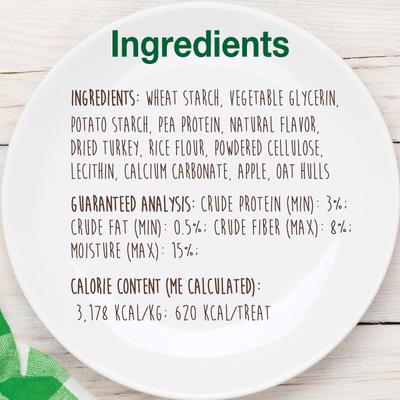 New Ingredients: Wheat Starch, Vegetable Glycerin, Potato Starch, Pea Protein, Natural Flavor, Turkey, Rice Flour, Powdered Cellulose, Lecithin, Calcium Carbonate, Apple, Oat Hulls.