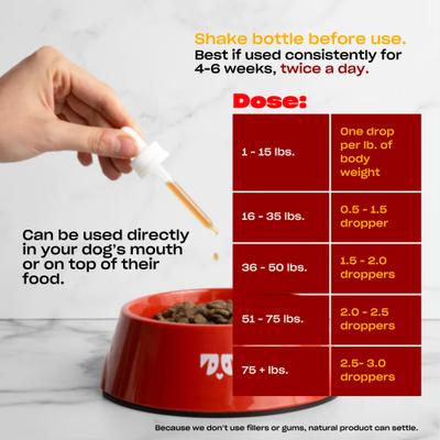 Shake well before use. Sedimentation may occur from natural ingredients. Follow the weight chart for correct dose or as advised by your veterinarian. To be taken twice daily. This is the minimum dose. Can be given during or after meal time.