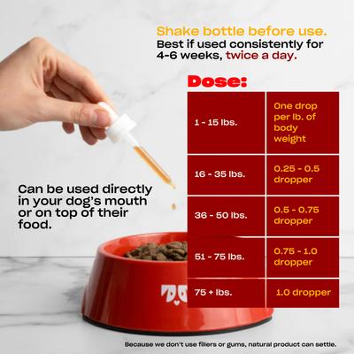 Shake well before use. sedimentation may occur from natural ingredients. Follow the weight chart for correct dose or as advised by your veterinarian. To be taken twice daily. This is the minimum dose. Can be given during or after meal time.