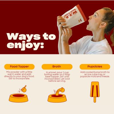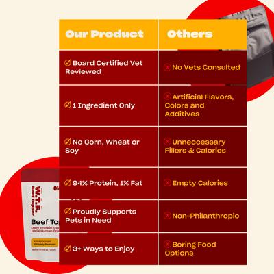 Give your furry friend a boost of protein with WTF Beef Topper. Made from only one ingredient—grass-fed, free-range beef, this topper is perfect for pups of all ages. It supports growth, lean muscle, and overall vitality. Whether served dry as a kibble topper, rehydrated into a broth, or frozen into pupsicle treats, this topper is a simple and delicious way to upgrade your furbaby’s meals. With no fillers or preservatives, it provides pure and healthy nutrition that your tail wagger will love. Plus, it’s ethically made in the U.S.A. for added peace of mind.