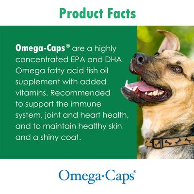Protect your pet from nose to tail! Omega-Caps Softgels Vitamin Supplement For Cats & Smaller Dogs is specially formulated with a comprehensive blend of essential omega-3 fatty acids, EPA, DHA, vitamins, chelated minerals and antioxidants. These ingredients help support your paw-tner’s immune system, joints, heart health and normal brain function. Vitamins A and D are important for maintaining your pal’s healthy bones, teeth, skin and hair, while vitamin E helps his body fight environmental pollutants by removing damaging free radicals. The fish-flavored capsules are formulated for small pets weighing less than 40 pounds—they can be hidden or spread on your paw-tner’s food if he’s uncomfortable eating them whole.