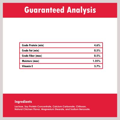 Lactose, Soy Protein Concentrate, Calcium Carbonate, Chitosan, Natural Chicken Flavor, Magnesium Stearate, and Sodium Benzoate.