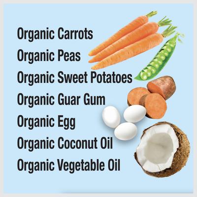 - Organic Carrots, Organic Peas, Organic Sweet Potatoes, Organic Guar Gum, Organic Egg, Organic Coconut Oil, Organic Vegetable Oil enhance this diet.