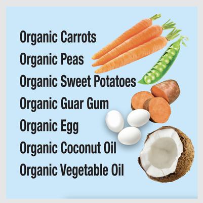 - Organic Carrots, Organic Peas, Organic Sweet Potatoes, Organic Guar Gum, Organic Egg, Organic Coconut Oil, Organic Vegetable Oil enhance this diet.