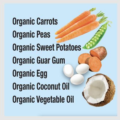 - Zanahorias orgánicas, guisantes orgánicos, batatas orgánicas, goma guar orgánica, huevo orgánico, aceite de coco orgánico y aceite vegetal orgánico enriquecen esta dieta.