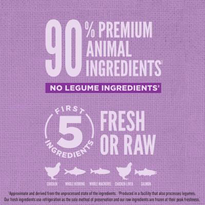 - The first five ingredients are fresh or raw chicken, whole herring, whole mackerel, chicken liver and salmon with protein, vitamins and minerals.