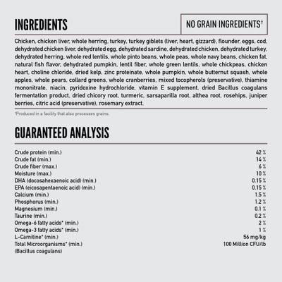 Chicken, Chicken Liver, Whole Herring, Turkey, Turkey Giblets (Liver, Heart, Gizzard), Flounder, Eggs, Cod, Dehydrated Chicken Liver, Dehydrated Egg, Dehydrated Sardine, Dehydrated Chicken, Dehydrated Turkey, Dehydrated Herring, Whole Red Lentils, Whole Pinto Beans, Whole Peas, Whole Navy Beans, Chicken Fat, Natural Fish Flavor, Dehydrated Pumpkin, Lentil Fiber, Whole Green Lentils, Whole Chickpeas, Chicken Heart, Pea Starch, Lentil Starch, Choline Chloride, Dried Kelp, Zinc Proteinate, Whole Pumpkin, Whole Butternut Squash, Whole Apples, Whole Pear, Collard Greens, Mixed Tocopherols (Preservative), Freeze-Dried Chicken, Freeze-Dried Turkey, Freeze-Dried Cod, Thiamine Mononitrate, Niacin, Pyridoxine Hydrochloride, Vitamin E Supplement, Dried Chicory Root, Turmeric, Sarsaparilla Root, Althea Root, Rosehips, Juniper Berries, Citric Acid (Preservative), Rosemary Extract, Dried Lactobacillus Acidophilus Fermentation Product, Dried Bifidobacterium Animalis Fermentation Product, Dried Lactobacillus Casei Fermentation Product.