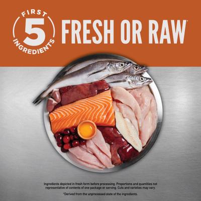 Chicken, Salmon, Turkey, Whole Whiting, Haddock, Dehydrated Turkey, Dehydrated Chicken,Dehydrated Herring, Dehydrated Chicken Liver, Dehydrated Egg, Whole Red Lentils, Whole Pinto Beans,Chicken Giblets (Liver, Heart, Gizzard), Eggs, Turkey Giblets (Liver, Heart, Gizzard), Chicken Fat, Wholegreen Lentils, Whole Navy Beans, Whole Chickpeas, Whole Peas, Natural Chicken Flavor, Pollock Oil, Driedapple Pomace, New Zealand Green Mussels, Dried Kelp, Whole Butternut Squash, Whole Pumpkin,Vitamin E Supplement, Salt, Zinc Proteinate, Mixed Tocopherols (Preservative), Whole Apples, Wholecarrots, Whole Pears, Whole Zucchini, Thiamine Mononitrate, Niacin, Riboflavin, Calcium Pantothenate,Pyridoxine Hydrochloride, Folic Acid, Vitamin B12 Supplement, Copper Proteinate, Beet Greens, Kale,Spinach, Turnip Greens, Whole Cranberries, Whole Blueberries, Dried Chicory Root, Turmeric, Sarsaparillaroot, Althea Root, Rosehips, Juniper Berries, Dried Bacillus Coagulans Fermentation Product, Citric Acid(Preservative), Rosemary Extract.