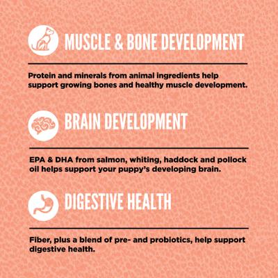 - This puppy dog food contains EPA and DHA from salmon, whiting, haddock, and pollock oil to promote brain development.