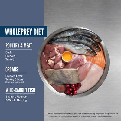 Salmon, Duck, Chicken, Turkey, Flounder, Whole Herring, Chicken Liver, Eggs, Dehydrated Egg,Dehydrated Chicken, Dehydrated Sardine, Dehydrated Chicken Liver, Dehydrated Mackerel, TurkeyGiblets (Liver, Heart, Gizzard), Whole Red Lentils, Whole Pinto Beans, Whole Green Peas, Ground WholeFlaxseed, Whole Green Lentils, Whole Chickpeas, Whole Yellow Peas, Whole Navy Beans, Hydrolyzed BlueWhiting, Hydrolyzed Salmon, Chicken Fat, Chicken Hearts, Whole Cranberries, Choline Chloride, DriedKelp, Vitamin E Supplement, Mixed Tocopherols (Preservative), Whole Pumpkin, Whole Apples, CollardGreens, Whole Butternut Squash, Whole Pears, Zinc Proteinate, Dried Chicory Root, Niacin, ThiamineMononitrate, Riboflavin, Calcium Pantothenate, Pyridoxine Hydrochloride, Folic Acid, Vitamin B12Supplement, Copper Proteinate, Turmeric, Sarsaparilla Root, Althea Root, Rosehips, Juniper Berries,Citric Acid (Preservative), Rosemary Extract, Dried Lactobacillus Acidophilus Fermentation Product,Dried Bifidobacterium Animalis Fermentation Product, Dried Lactobacillus Casei Fermentation Product.