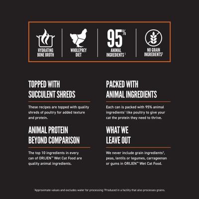 Indulge your feline friend with the ORIJEN Original & Salmon & Chicken Entree Variety Pack Chunks & Shreds Wet Cat Food. This hearty and protein-rich cat food is made with nourishing WholePrey animal ingredients and flavorful bone broth to keep your cat hydrated and satisfied. The variety pack includes two delicious recipes (Original Entree and Salmon & Chicken Entree) providing the variety your cat craves. Each recipe is packed with 95% animal ingredients and WholePrey inclusions like chicken liver and salmon to satisfy your cat’s carnivorous nature. Plus, the recipes are free from grains, potatoes, carrageenans, peas, lentils, and legumes. They also help promote eye health and healthy skin and coat with taurine, vitamin A, and naturally occurring omega-6 and omega-3 fatty acids. Give your cat the taste and texture of real meat, poultry, and fish in every bite with this wet cat food variety pack.