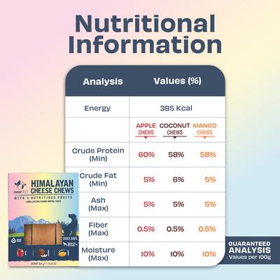 - Made with apple, coconut, and mango, these large chews are rich in protein and calcium.