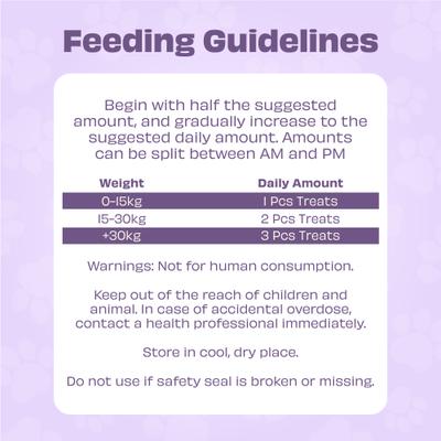 Help your furry friend find peace and relaxation with the Pawlet Wild Vigor Zen Calm Bites Chew Calming Supplement for Dogs. This specially crafted formula is designed to help alleviate stress and improve emotional balance. Chamomile, valerian root, and passion flower work together to calm nerves and promote a peaceful state. L-theanine, L-tryptophan, and ashwagandha support serotonin levels and reduce anxious behaviors. Hydrolyzed milk protein (Lactium) and magnesium citrate aid in relaxation and enhance sleep quality. Choline and glycine also contribute to cognitive function and focus, while banana, blueberry, and chicken liver provide essential nutrients for overall wellbeing. Additionally, sustainable insect protein and coconut offer additional stress-relief properties, ensuring your dog’s health and comfort.