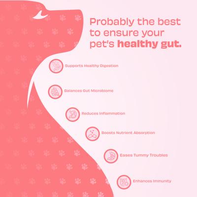 Help your furry friend maintain a healthy digestive system with the Pawfect Wild Vigor Gut Guard Bites Chew Digestive Supplement for Dogs. This powerful blend of natural ingredients supports optimal digestion, regular bowel movements, and a balanced gut microbiome. Fiber-rich ingredients like pumpkin, psyllium husk, and beetroot, help your pet experience smooth digestion. This supplement also contains a six-strain probiotic and prebiotic with dandelion root and apple pectin to fuel beneficial gut bacteria. Anti-inflammatory ingredients like green turmeric and green ginger help soothe the digestive tract and promote healing. Detoxifying milk thistle, along with antioxidant-rich spinach and green tea leaves, supports nutrient absorption and overall digestive efficiency. Mint leaves and banana help ease stomach discomfort, while flaxseed provides essential omega-3s to support immunity, making your pet’s gut a fortress of health.