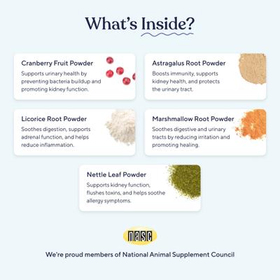 ACTIVE INGREDIENTS Cranberry Fruit Powder, Astragalus Root Powder, Licorice Root Powder, Marshmallow Root Powder, Nettle Leaf Powde