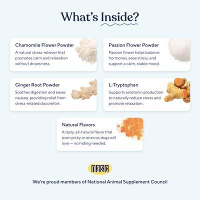 Chamomile Flower, Powder Passion, Flower Powder, Ginger Root, Powder, L-Tryptophan, Brewer's Yeast, Chicken, Citric Acid (Natural Preservative), Flaxseed (Organic), Glycerin (Vegetable), Natural Turkey Flavor (Vegetarian), Palm Fruit Oil (Organic, RSPO), Pea Protein Concentrate, Sunflower Lecithin, Sweet Potato Flour.