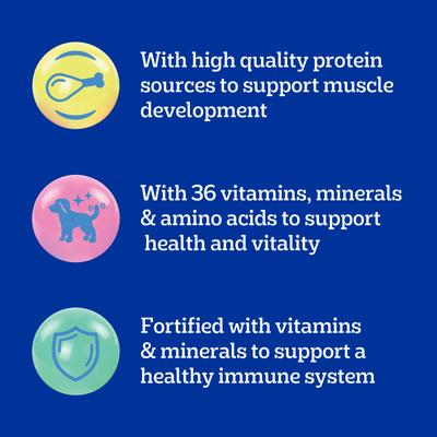 - Dry puppy food fortified with vitamins and minerals to support a healthy immune system.