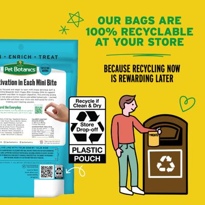 Pet Botanics Training Rewards Soft & Chewy Mini Treats are perfect for training and treating every day in every way. These bite-sized treats are packed with great flavors and enticing aromas, made from high-quality ingredients, palatable pork liver, and real proteins that keep pups focused and eager to learn. These yummy rewards are great for training sessions, enrichment activities such as puzzles and snuffle mats, and everyday treating occasions.
