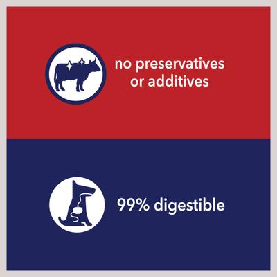 - Long-lasting beefhide is 99% digestible and provides a safer outlet for dogs who are “chew paw-fessionals”.