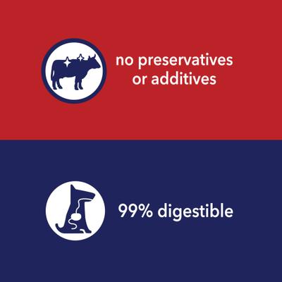 - Long-lasting beefhide is 99% digestible and provides a safer outlet for dogs who are “chew paw-fessionals”.