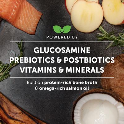 Inactive Ingredients: Turkey Bone Broth, Coconut Glycerin, Manganese Glycinate, Salmon Oil, Citrus Fiber, Salmon Powder, Natural Flavors, Zinc Glycinate, Dried Egg Product, Citric Acid (Preservative), Apple Cider Vinegar, Brewer's Dried Yeast, Glucosamine Hydrochloride, Hydrolyzed Yeast, Dried Bacillus Licheniformis Fermentation Product, Dried Bacillus Subtilis Fermentation Product, L Ascorbyl 2 Polyphosphate (Vitamin C), Mixed Tocopherols (Preservative), Dried Lactobacillus Acidophilus Fermentation Product, Niacin (Vitamin B3), A Tocopherol Acetate (Vitamin E), Vitamin B12 Supplement, Thiamine Mononitrate (Vitamin B1), Calcium Pantothenate (Vitamin B5), Riboflavin (Vitamin B2), Pyridoxine Hydrochloride (Vitamin B6), Folic Acid (Vitamin B9).