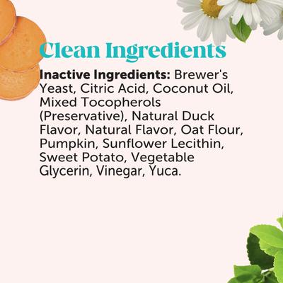 Inactive Ingredients: Brewer’s Yeast, Citric Acid, Coconut Oil, Mixed Tocopherols (Preservative), Natural Duck Flavor, Natural Flavor, Oat Flour, Pumpkin, Sunflower Lecithin, Sweet Potato, Vegetable Glycerin, Vinegar, Yuca.