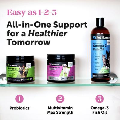 Keep your fur-iend in tip-top condition with the help of Pet Honesty SuperVitamin + Max-Strength Smoked Salmon Flavored Soft Chews All-In-One Vitamin Supplement For Dogs. These hickory-smoked, salmon-flavored soft chews feature a blend of real superfoods packed with vitamins and minerals. They contain ingredients to support 15 areas of your doggo’s health, from energy and joint mobility to immune and digestive support. A powerful mix of probiotics, glucosamine, omegas and veggies promote your pup’s immune support, while also supporting his joint, gut, heart, kidney and cognitive health. What’s more, these tasty morsels are free from chemicals, harsh preservatives, GMOs, wheat, soy and corn.