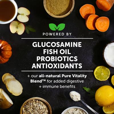 Active Ingredients: Glucosamine, Psyllium Husk, Pumpkin, Organic Mushroom Blend (Reishi, Cordyceps, Chaga, Mesima, Lion's Mane, Turkey Tail, Maitake, Shiitake, Blazei, Poria, Agarikon, Suehirotake, Oyster, And True Tinder , PurforMS, Fish Oil (Anchovies, Mackerel, Herring, Sardines), Chondroitin Sulfate, Vitamin C (Ascorbic Acid), Dandelion Root, Probiotic Blend (10%)Lactobacillus Acidophilus, Bifidobacterium Bifidum, Lactobacillus Lactis, Lactobacillus Plantarum, Lactobacillus Brevis, Enterococcus Faecium, Lactobacillus Fermentum And Silicon Dioxide, Apple Cider Vinegar, Niacin, Tynagentm, Zinc Chelat, Manganese Chelate, Selenium Yeast , Vitamin A, Vitamin D3, Vitamin E (D-Alpha Tocopherol), Vitamin B1 (Thiamine), Pantothenic Acid, Vitamin B6 (Pyridoxine), Vitamin B2 (Riboflavin), Folic Acid, Biotin , Vitamin B-12