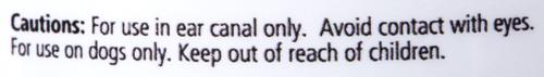 For use in ear canal only. Avoid contact with eyes. For use on dogs only. Keep out of reach of children. For Dogs over 12 weeks of age.