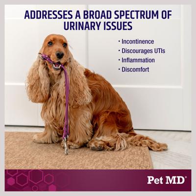 For effective urinary tract support for dogs, reach for Pet MD Bladder Support Plus Cranberry. This veterinarian-formulated supplement is designed to support a healthy urinary tract and immune system. Each chew is packed with cranberry and marshmallow root to help reduce inflammation and relieve uncomfortable urinary tract infection (UTI) symptoms. They also feature wild yam root and rehmannia to encourage normal bladder control. This comprehensive chew is paw-fect for dogs ages 12 weeks and older experiencing a UTI, bladder control issues and other urinary concerns.