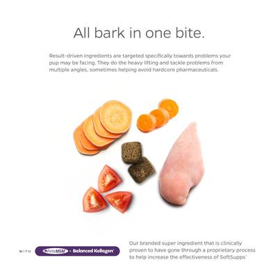 Provide your pup with the support he needs with Pet Parents Hip & Joint SoftSupps Mobility Hip & Joint Dog Supplement. It contains powerful nutrients with glucosamine chondroitin, MSM and green-lipped mussel to promote joint health in your furry friend. This supplement eases discomfort by providing pain relief and nourishes joint tissue while helping to maintain cushion between joints. It also features whole meats and veggies, not rice and oats, to keep your paw-tner going strong. Made in the USA, Pet Parents Mobility Hip & Joint Chicken Flavored Dog Supplement is grain, corn and soy-free for those companions with sensitivities.