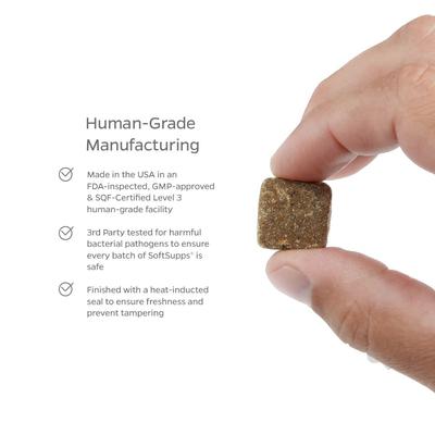 Glucosamine HCL 200 mg, PurFor MSM 120 mg, Proprietary Enzyme Blend (Amylase, Protease, Lipase, Cellulase, Lactase, Bromelain) 100 mg, FOS (Fructooligosaccharides) 100 mg, Chondroitin Sulfate 80 mg, Salmon Oil 50 mg, Vitamin C 20 mg, Niacin 20 mg, Coenzyme Q10 10 mg, Vitamin B1 2.3 mg, Manganese 2 mg, Pantothenic Acid 1.59 mg, Vitamin B6 1.57 mg, Vitamin B2 1.33 mg, Folic Acid 235 mcg, Biotin 21 mcg, Vitamin B12 5.4 mcg, Vitamin A 4,000 IU, Vitamin D3 270 IU, Vitamin E 8.8 IU, Proprietary Probiotic Blend (Lactobacillus acidophilus, Lactococcus lactis, Lactobacillus plantarum, Lactobacillus fermentum, Lactobacillus brevis with 10% Fructooligosaccharides). 1 B CFUPea Flour, Palm Fruit Oil, Chicken, Tapioca Flour, Chicken Liver, Flaxseed, Sweet Potato, Tomato, Carrot, Sweet Potato, Sunflower Lecithin, Powdered Cellulose (coating only), Coconut Glycerin, Sorbic Acid, Rosemary Extract, Mixed Tocopherols.