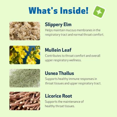 Active Ingredients: Slippery Elm Bark (Ulmus fulva), Mullein Leaf (Verbascum spp.), Usnea thallus (Usnea barbata), Deglycyrrhizinated Licorice Root (Glycyrrhiza glabra).
